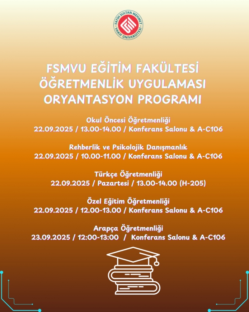 Fatih Sultan Mehmet Vakıf Üniversitesi Eğitim Fakültesi Öğretmenlik Uygulaması Oryantasyon Programı detayları aşağıda belirtilmiştir. Katılımınız önemle rica olunur.